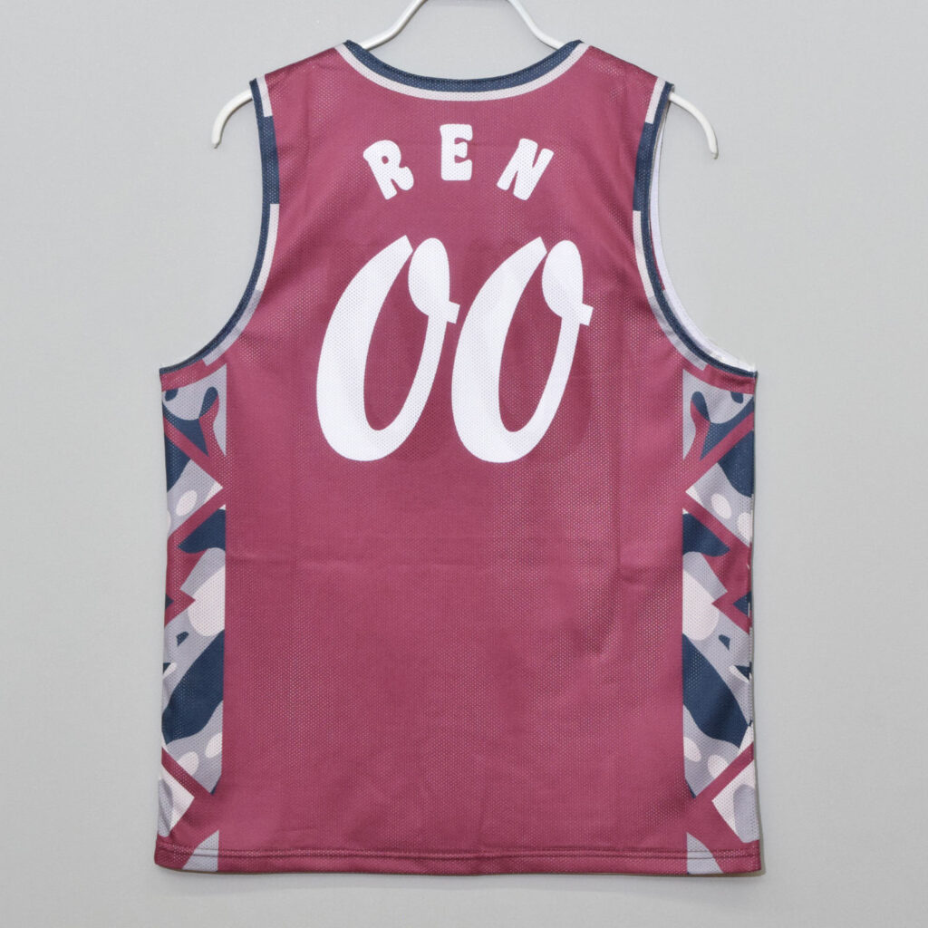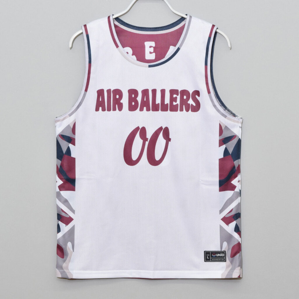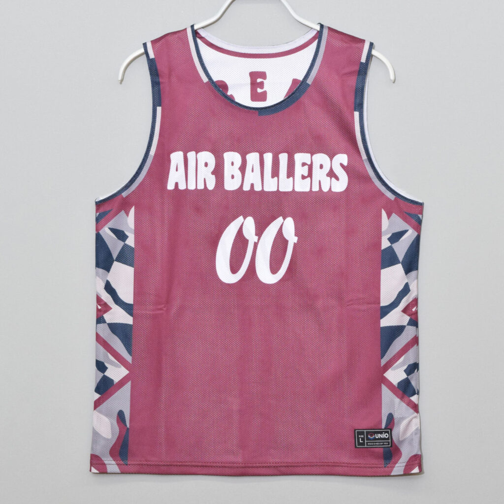 サイドに弾むグラフィックが目を引くエンジ色のリバーシブルユニフォーム